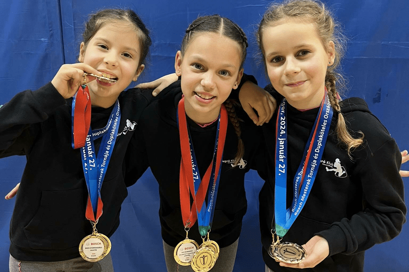 RészletekHorváth Sára, Nagy Maja, Simon Emma a kétköteles gyorsasági és szabadon választott gyakorlatban is első helyen végeztek az országos bajnokságon Egerben. ( Gyerek korosztály) Molnár Emma, Németh Li...